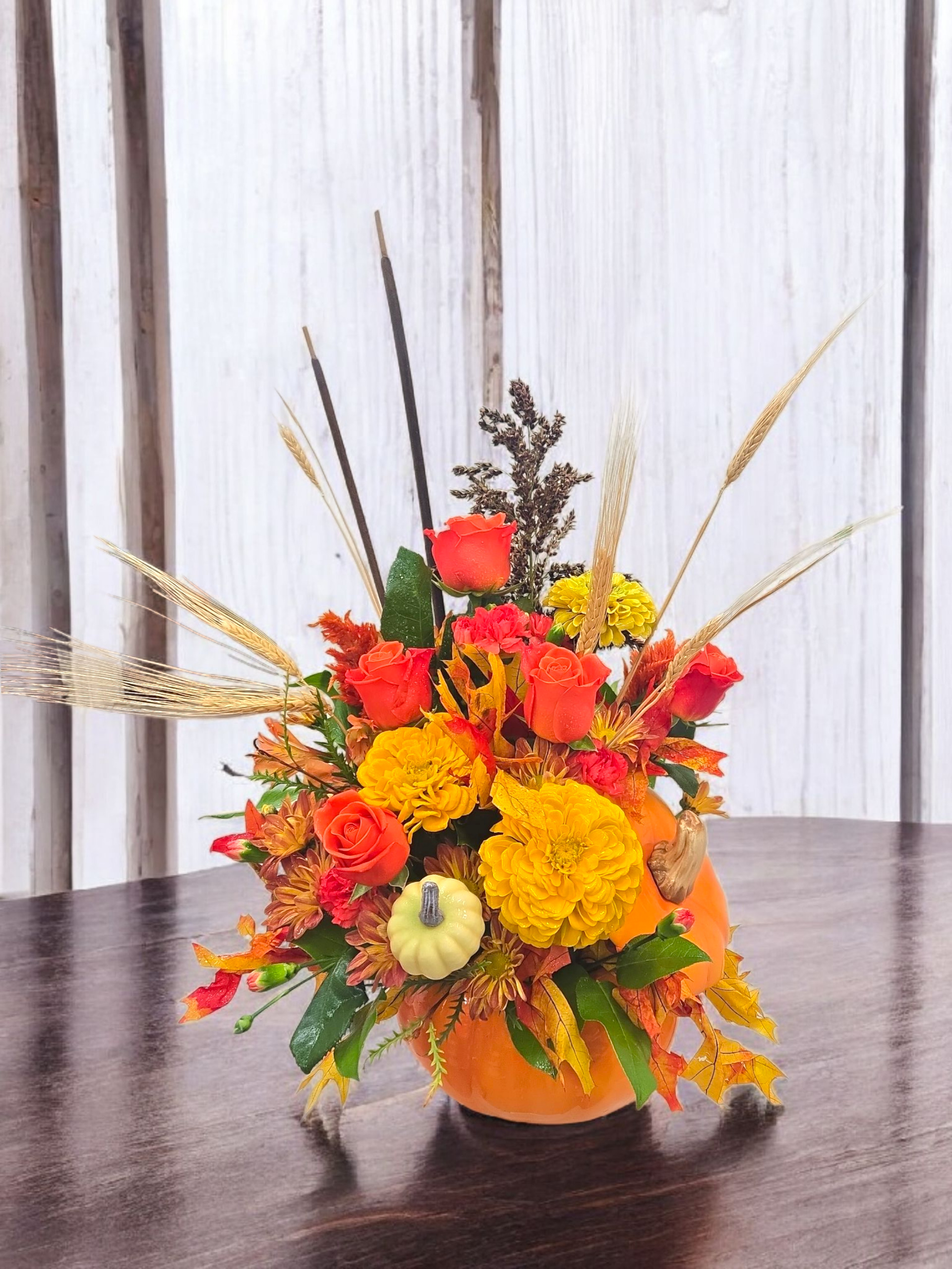 Warm Fall Wishes Bouquet Ceramic Pumpkin Pot in Laurel, Maryland | Lea's Flower Shop